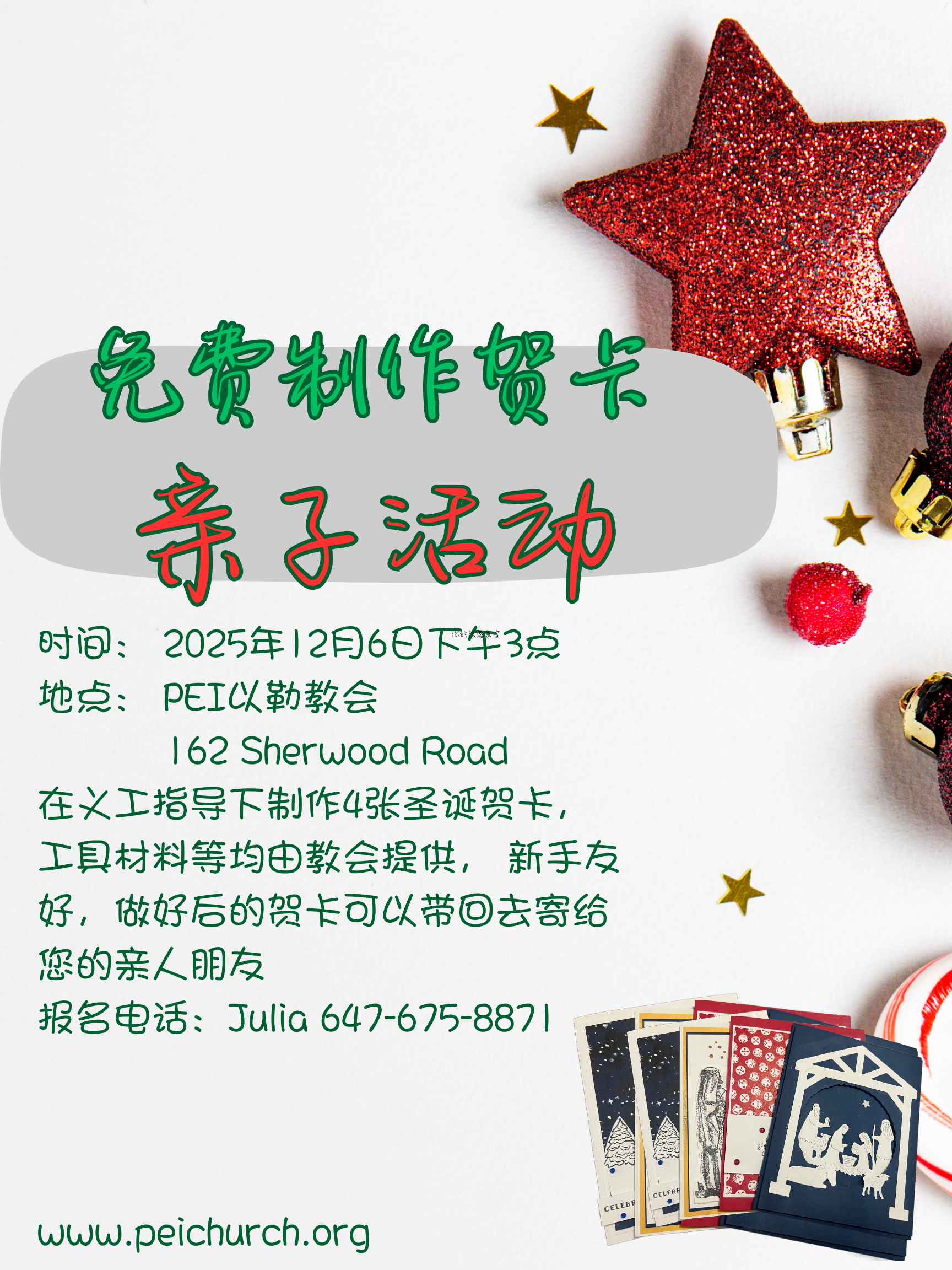 时间2025年12月6日地点PEI基督教以勒教会162 Sherwood Road, 在义工指导下制作四张圣诞贺卡, 工具材料等由均由教会提供, 新手有好, 做好后的贺卡可以带回去寄给你的亲人朋友报名电话 Julia 647 675 8871